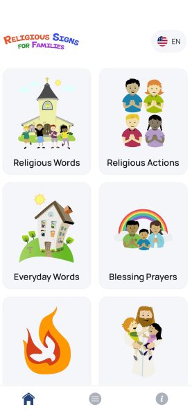 The Religious Signs for Families app is a delightful and engaging way to learn ASL using religious words that are not often found in other ASL apps. The goal of the app is to help families with young Deaf children and Deaf couples with young children to foster prayer in the home. This app provides a way for families to connect while learning religious signs and to bond to one another and God as they pray in ASL. Users extend beyond the family unit because this app is perfect for anyone who wants to learn and use ASL to pray. All religious words have been selected from a Christian prayer context; however, there are many words that are used in other religious denominations.
