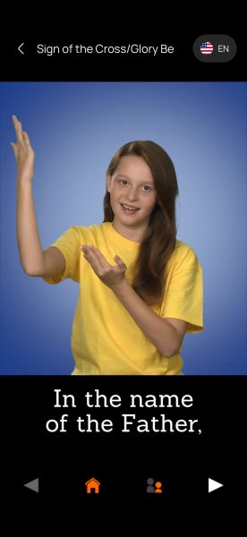 To navigate to a word/phrase/prayer category, choose a category on the home page. When in a category, use the left and right arrows in the bottom bar to navigate to other videos in that category. Tap the model icon to view an Adult or Child ASL model. Tap the home icon to go back to the main menu. On the home page, tap the menu icon to see a text-only menu of all words/phrases. Choose your desired language by tapping on the language box in the top right corner.