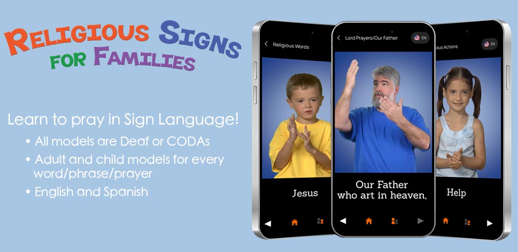 Did you ever want to learn to pray in American Sign Language (ASL)? The Religious Signs For Families app makes learning fun and easy! You and your child learn by watching children and parents sign religious words and prayers. All the ASL parent models are Deaf parents, and all the child models are Deaf children or Children of Deaf Adults (CODAs). Their expert signing is simple to follow and enjoyable to watch.
