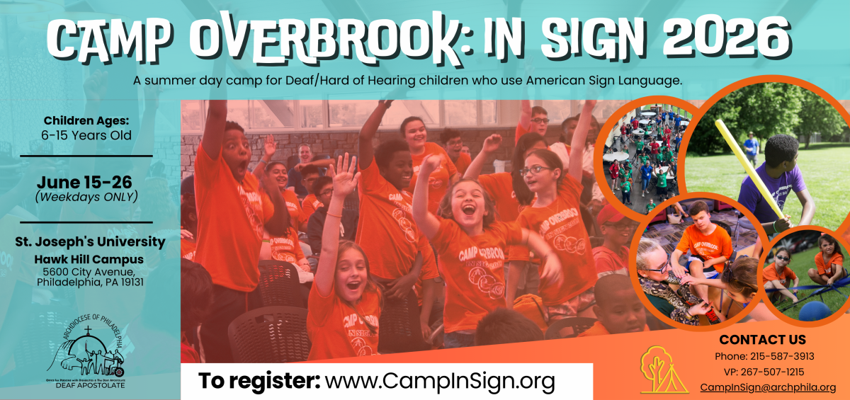 Camp Overbrook: In Sign 2026 is a ten-day summer day camp for children who are Deaf or Hard of Hearing. Camp is held on weekdays, Monday, June 15- Friday, June 26, 2026 at Saint Joseph’s University, Hawk Hill Campus, 5600 City Avenue, Philadelphia, PA 19131. Art, field activities, daily bible classes and other fun learning activities are offered in sign language. Some counties may provide transportation if parents request it at their IEP meeting. For Phila. District students, door to door transportation will be provided for those who register by March 20, 2026 (those who register late are responsible for their own transportation). Partial scholarships are available. For more information call the Deaf Apostolate at 215-587-3913 (phone) or 267-579-3351 (video phone) or email deafcatholic@archphila.org. For Spanish Language users call Natalie at 215-587-3530 for information and assistance with registration. To register online click here.